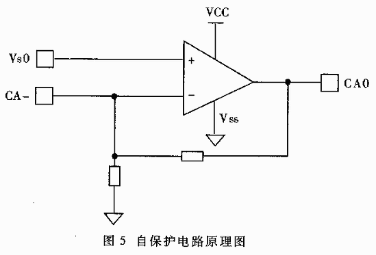 自保护电路如图5所示。外围电路中的参考地运算放大器通过引脚VsO的设定值与流入CA-引脚的电流在反馈电阻上产生的电压相比较,如果超出设定或调整的VsO参考值,IR2130驱动器的内部电流保护电路启动关断输出通道,实现电流保护的作用。IR2130芯片内部也有硬件保护电路。如果负载或驱动电路出现过电流或欠电压的情况,IR2130驱动器的FAULT引脚会输出制动信号,通常这个输出信号接到DSP的PDPINT引脚上,拉低PDPINT引脚的输入电平,关断DSP的所有输出并置为高阻状态,实现整个控制电路的保护作用。